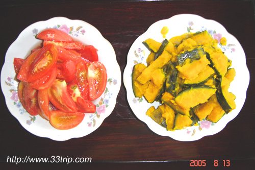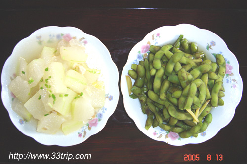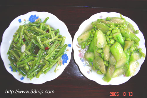 一些无公害时令蔬菜(凉拌番茄、炒南瓜、冬瓜扁尖、盐水毛豆、豇豆、丝瓜毛豆) | ||